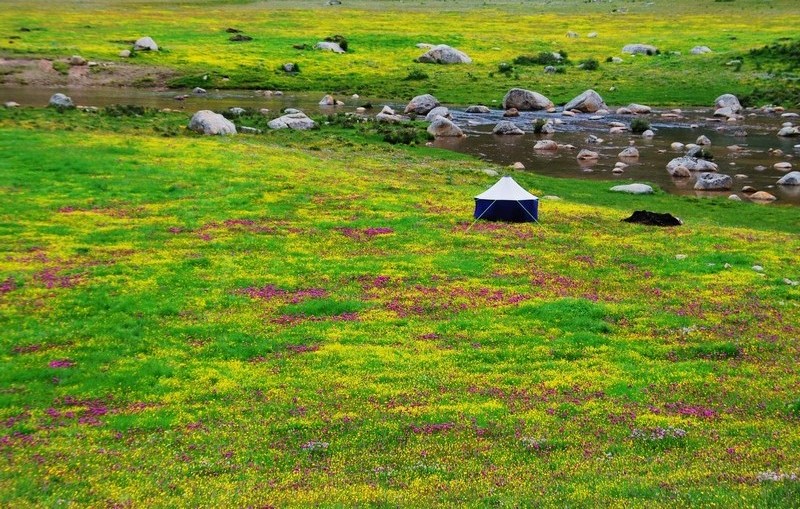 l两湖间美丽的草甸,仙女湖尽头需淌水过河