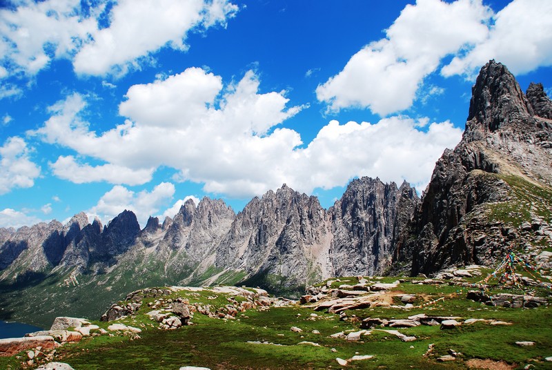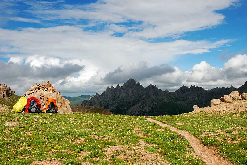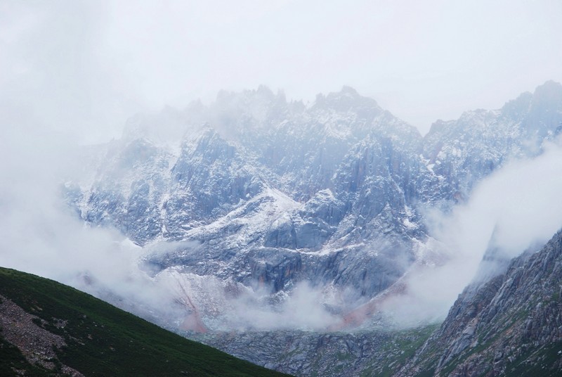 3点左右开始爬山,路径明显,上了一坡又一坡,之前有几次疑似垭口,最后到达有玛尼堆的那个才是正版。4点半左右上到垭口,于是休息,等人,拍pp。不料霎时狂风,大雨,冰雹,扑面而来,于是下山……