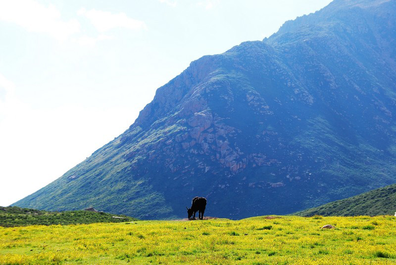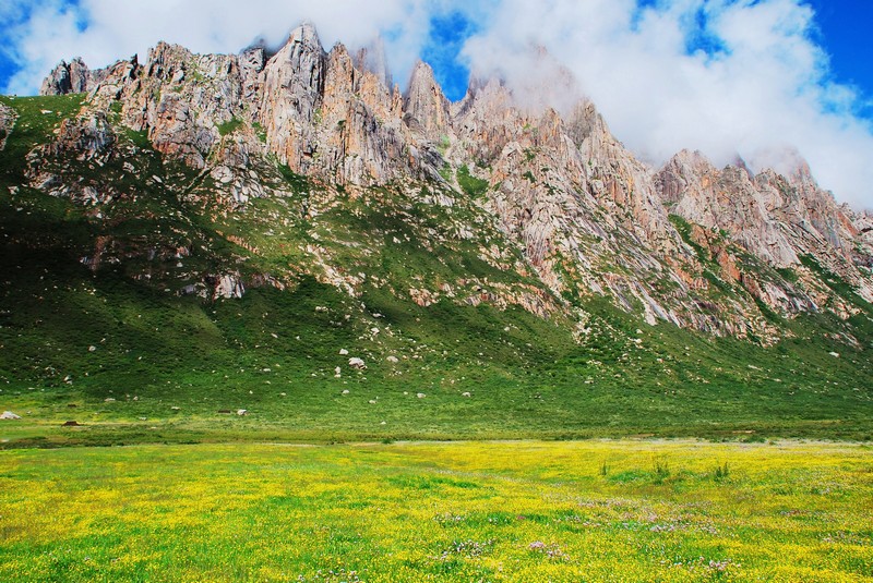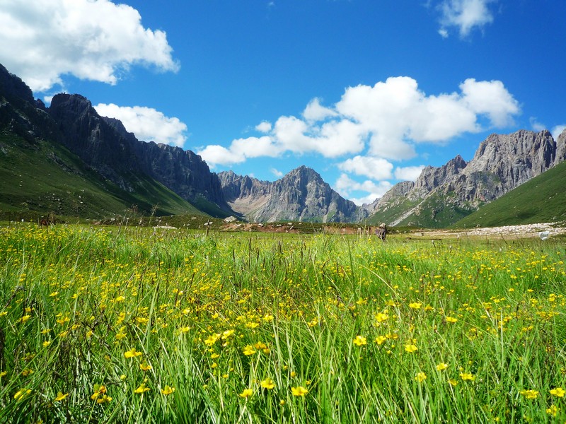 从妖女湖通往垭口的路上是一片金黄花海,美的无法用文字形容,还是看pp吧,来年宝玉则,季节很重要啊!走过这片海,通往垭口的山谷就在左前方,开始上山,路径明显,有很多条平行的小路,找一条走就是,殊途同归。