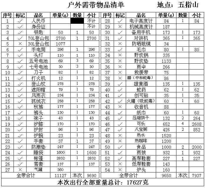 实际可以做一个背负的物品清单是包含全部可能需要的物资,根据行程长短、天气情况、出行季节、活动的难易程度做出选择。在表格上做出记号后照图索骥就可以了。将我常用的物资清单和参考重量列出。实际上根据物品的价格、产地、选用的质量等因素,你实际携带的物品重量会和表中的参数有很大的差异。千万不要按表中的重量来计算你背负的轻重。我公布的所有物品重量都是经过称重的。虽然准确但也只是对我而言。在此也只是提供给各位驴友参考而已。