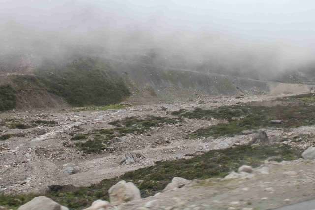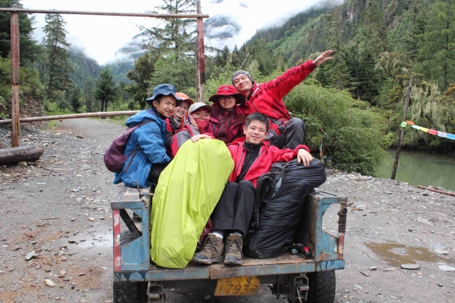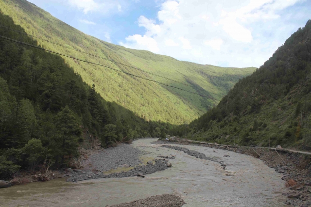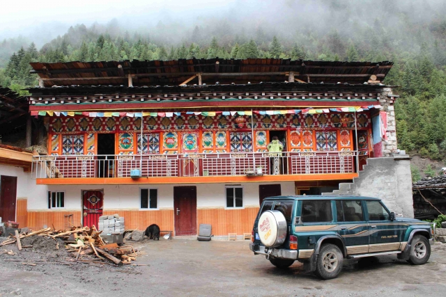 折多山是真正的汉藏分界线,幸运的见识了一山分阴阳的景象:上山时阴雨蒙蒙,以致垭口标志牌都没有看清;下山已是阳光灿烂,牛羊在草甸上嬉戏,背景是高山和白云。17:15到达九龙路口,赶紧下车开闸放水;随后沿力丘河谷而上,河水掏空路基比比皆是,两小时后到达沙德。吃过晚饭,坐上伍吉的越野车赶往苦西绒村;大雨瓢泼加之道路颠簸,我在最后一排跟行李打挤自然苦不堪言。九点半到达伍吉家里,简单整理、讨论后睡觉。