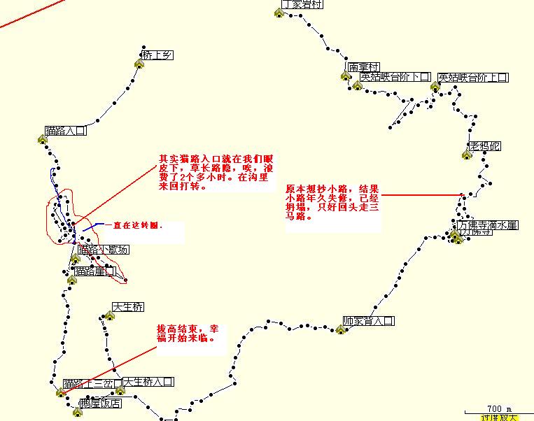不过最好在从老鸦砣出来的时候,问一问村里年纪大的村民,他们会把正确的方位指给你的。如果你能看到本文的航迹图,用指南针对准方位走也不会有错。