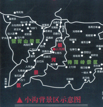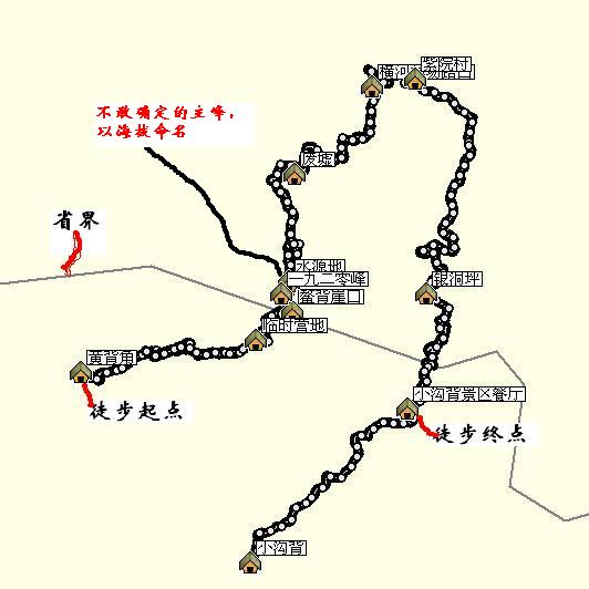 黄背角村(海拔494米)-溪谷-上山最后的水源地(临时营地,海拔1274米)-鳌背悬崖口(海拔1858)-鳌背顶峰(海拔1926米)-水源地(海拔1870米)-桃花寨(1850米)-三岔路口(海拔1670米)-废墟(海拔1523米)-横河林场水泥路口(1400米)-紫院村(1193米)-不知名山村-银洞坪(913米)-小沟背景区餐厅(海拔779米)-小沟背景区大门(510米)