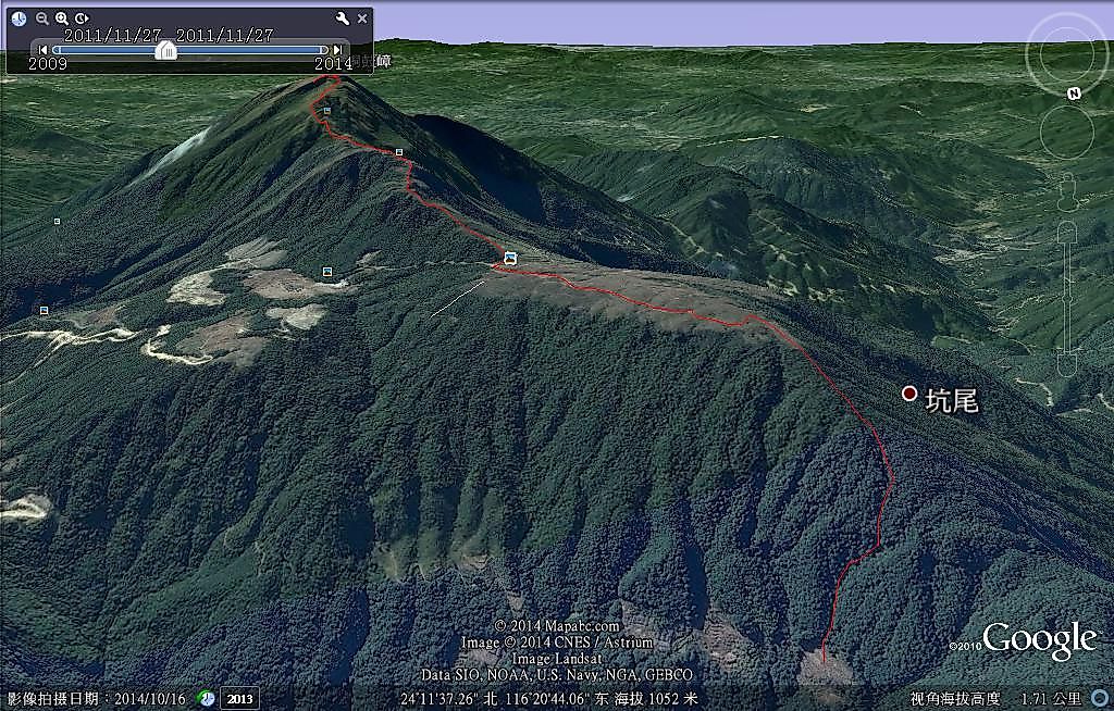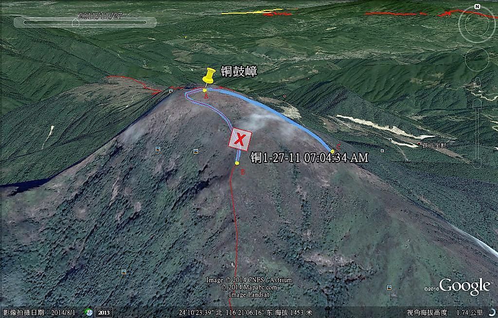 2011年探路情况:A点至C点开始有明显路迹,C点后是悬崖,不通。A点至B点路迹清楚,到B点后往下看,可以看到路迹往下一直延伸,可以判断是南线登山道,由于时间关系,没有继续往下走。