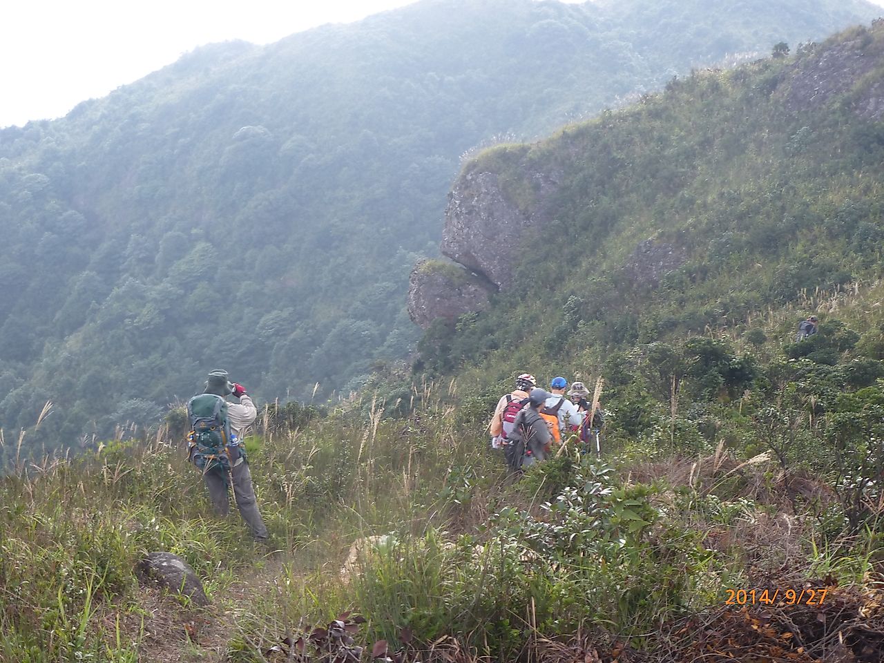 9月27日,气象团报告基本准确,早晨阳光明媚,气温较高。 8点整全体成员到达仙花营,开始了一天的活动。由于部分人员对线路认识不足,一开始上山就遇上有点陡的石阶路,在不到明山村的一半路途,就有一名队员退出了。不到11点,部分体能好的队员已经达到茶场,11时15分全部人员到齐开始午餐休息。到达茶场大概用时3小时,路程6.9公里,有部分负重拉练的队员体力开始跟不上了,负责收队的东方兄开始收取物资了,真的成了名符其实的“收队”---帮忙接收物资负重的收队。12时20分,开始登银窿顶,绕回到板盖坑上面的小路往上爬。登顶过程中,又有一些队员出现体力跟不上的情况,开始“喷药”处理了,我的脚也开始抽筋。下午约2时20分,全部人员终于到达山顶,比计划中的时间慢了将近1小时,登顶路程约10公里。经过短暂的休息,2时40分开始下山,由于部分队员出现体力透支的现象,这时领队决定改变线路从关肚里茶场下撤到赤树坪乘车回去,下山的路上,队伍明显分成了两部分,一快一慢,而且拉开了比较大的距离。落后的队伍中,有些新童鞋膝盖出现了小问题,在较陡的地方要用手扶着膝盖帮助下山,有些负重的队员步履蹒跚了,但仍然坚持着,不肯减轻负重,坚持走完全程。下午5点40分,乘着落日的余辉,我们终于到了赤树坪的水泥路,看到了盼望已久的、被队员咒骂的、不肯开上山接我们的中巴车了。一路上,在全体童鞋的相互鼓励和帮助下,顺利完成了负重拉练活动,回到车上,大家基本上是水尽粮断,部分队员只好用口香糖绑口水望梅解渴了。