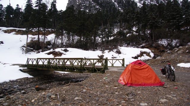 我们在第一座山离垭口还有6公里的地方止步,因为积雪已经到膝盖,自行车无法在那么后厚的雪地推行。我们搭车返回丙中洛休整,再作决定。