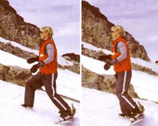 在做直滑降時,想信有些人發現板子會莫名其妙的往左或往右跑,那是因為做直滑降時,兩腳往前踩的力量不一樣,造成板子會往踩比較重的那方跑去,我們也是要利用這種道理來練習落葉飄。