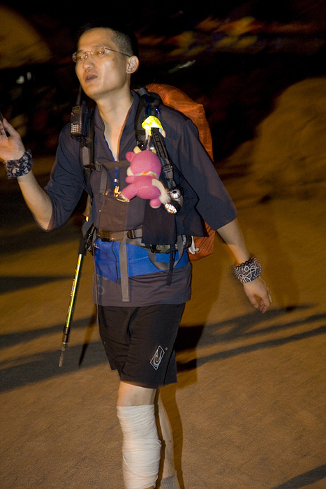 而过山风队的云河大侠则不幸栽倒在仙湖,可能由于太黑,车轮骑在两个水泥板中间缝了,摔得很惨,只能放弃了后面所有的路程。
